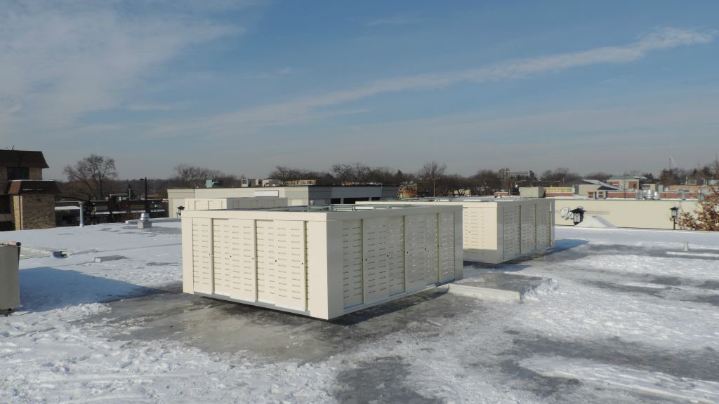 A cream louvered screen that complements the healthcare facility’s design. The system hides mechanical equipment and contributes to a calm, professional atmosphere. It is installed with careful attention to airflow and clearance requirements.