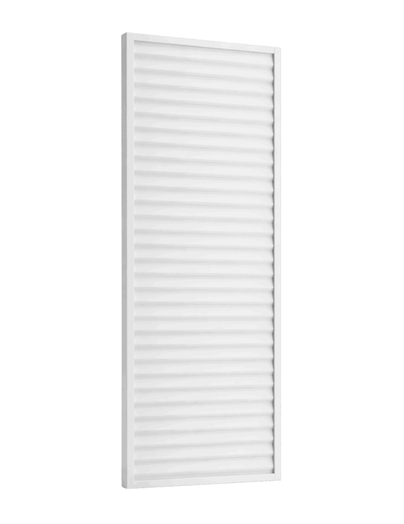 This panel mounts to rooftop curbs and features vertical rib detailing with perforation. The design supports airflow while adding height and visual rhythm.